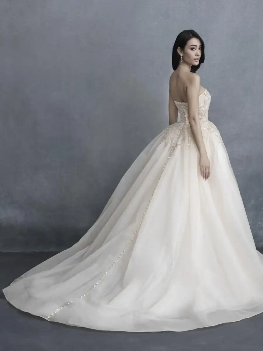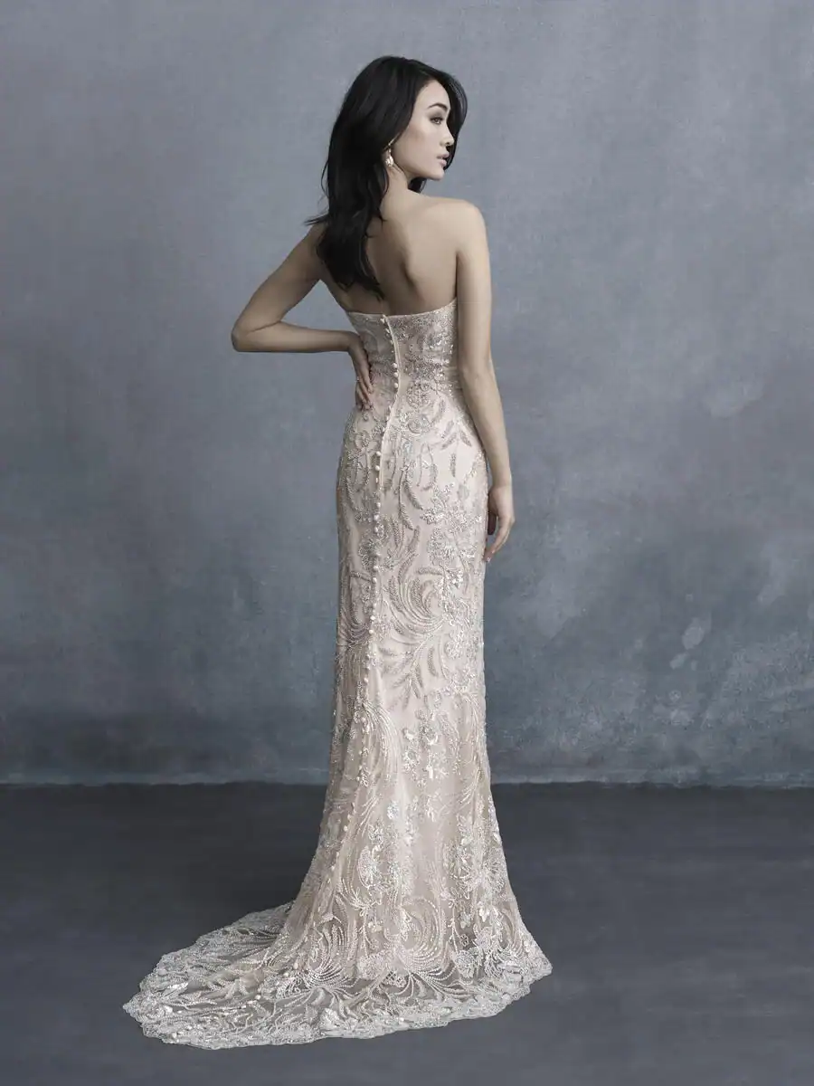 The gown features a cathedral train with alternating crystal and buttons down to the end of the train. The fitted gown has a sweep train and a modified sweetheart neckline.