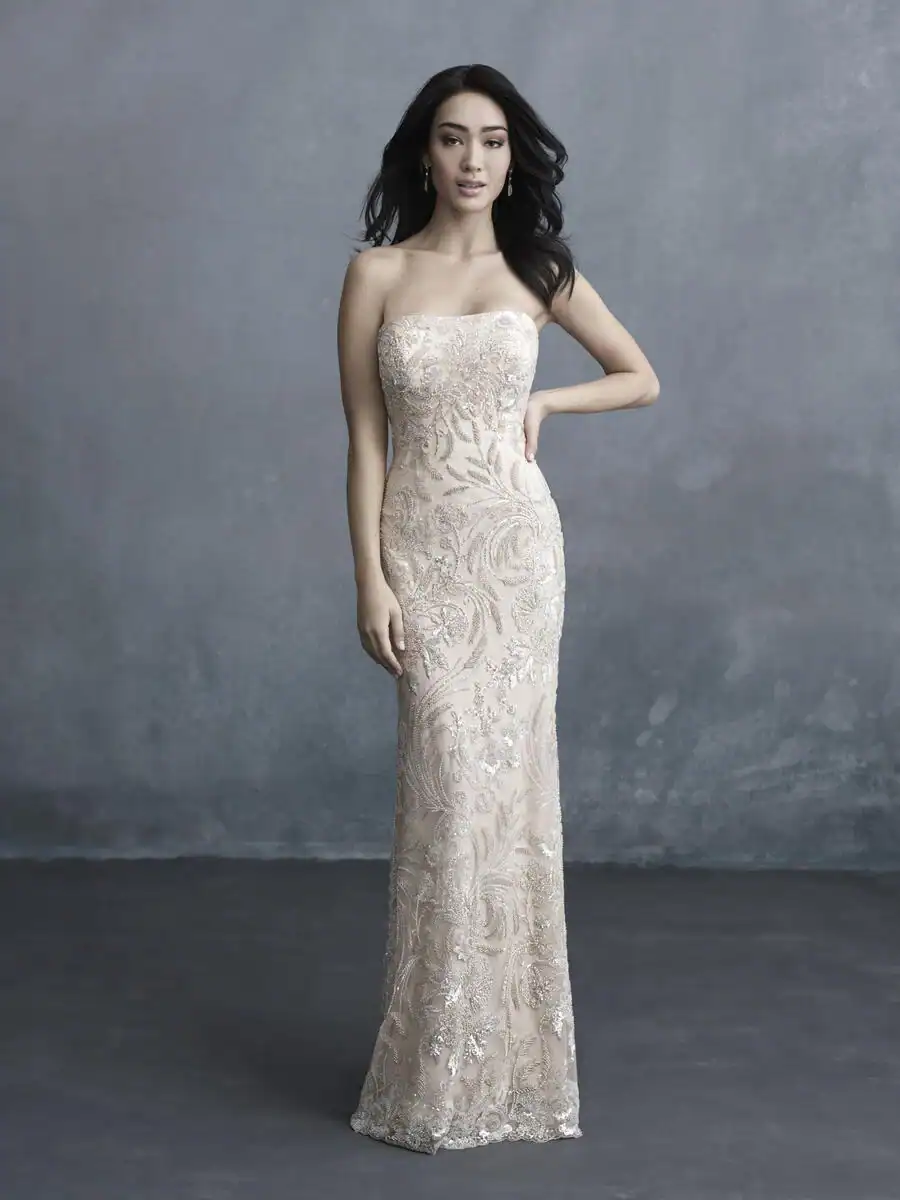 This dress is perfect for a bride who wants a glamorous and regal look for her wedding. It is fully beaded from top to bottom and can be worn in two stunning ways. One way is with the embellished overskirt, and the other is with a shimmering fitted gown for the reception. Please note that the dress comes with an embellished overskirt, which is valued at $900.