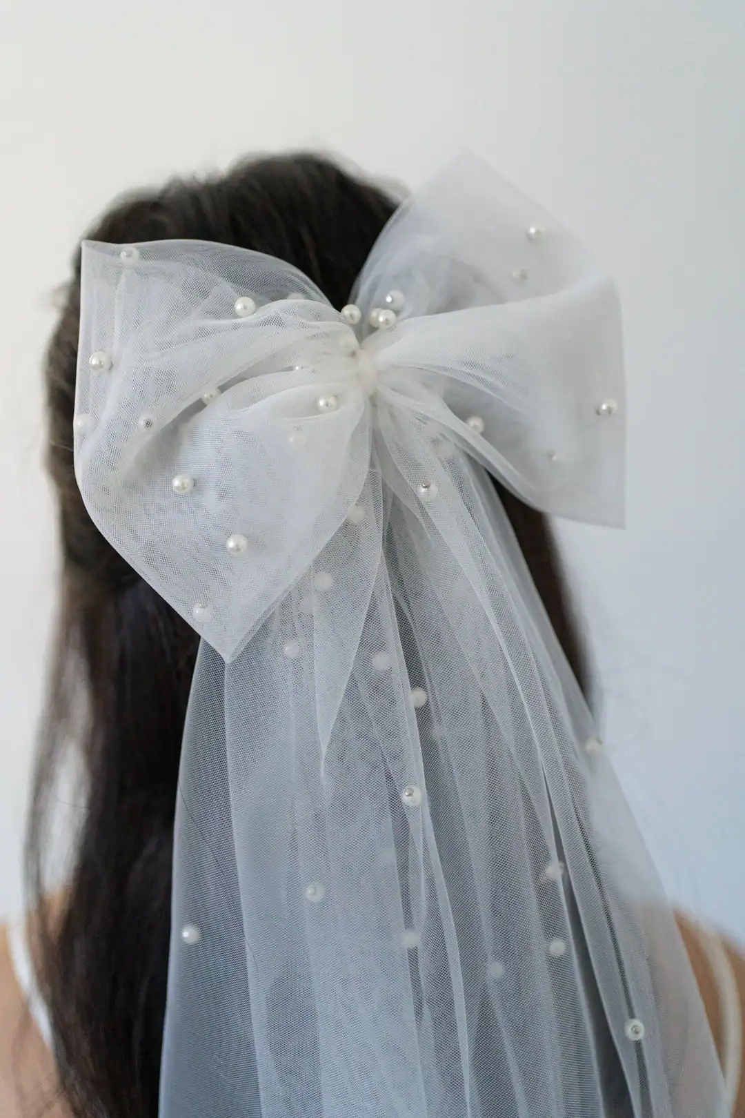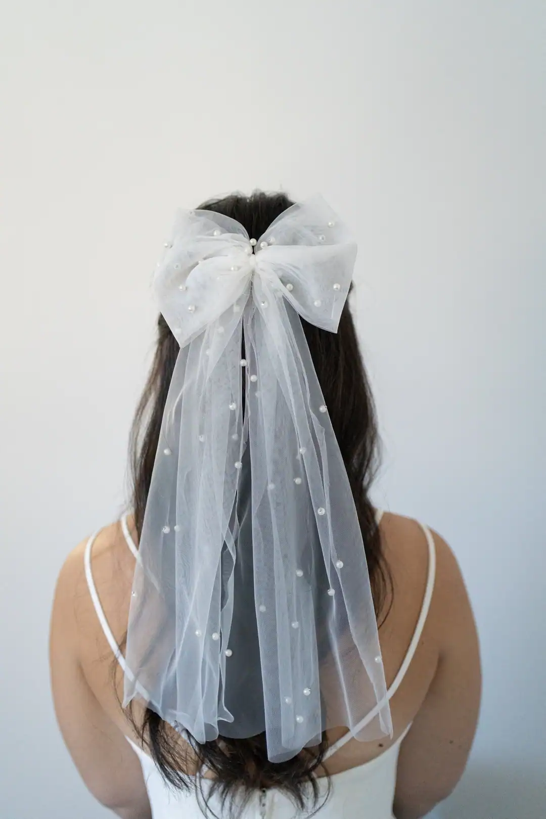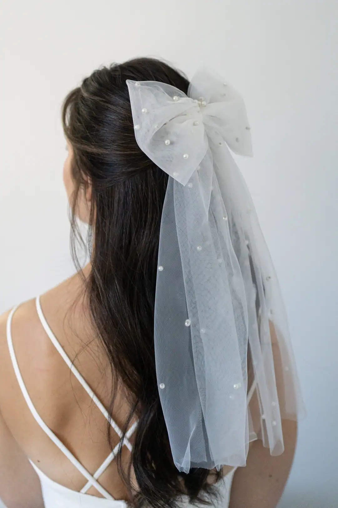 No bridal look is complete without a bow! This gorgeous handmade bow is a fun and unique addition to your wedding day! This beautiful bow is handcrafted and covered in pearl beads.